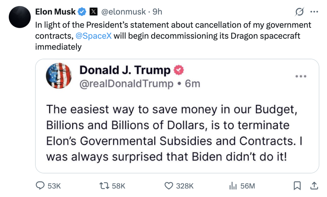 马斯克曾是特朗普政府“政府效率委员会”(DOGE)的联合主席,获得特朗普亲授“象征性大钥匙”。在政商联盟的蜜月期,他投入了超过7500万美元支持特朗普迈入第二任期,并协助起草多项“去监管”建议。但当马斯克对“大美丽法案”提出反对后,特朗普迅速翻脸,扬言要取消其企业所有政府合同。