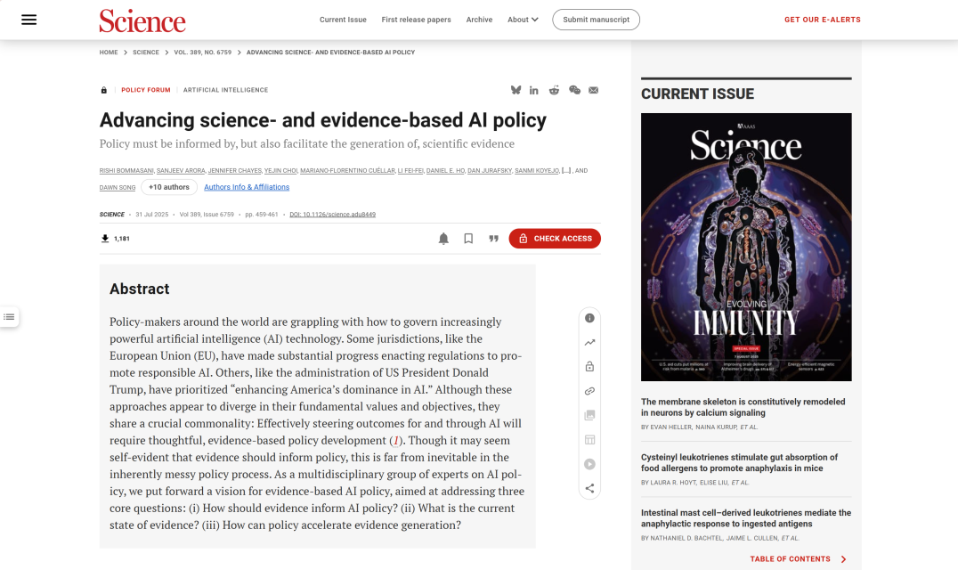 2025年7月31日,《Science》杂志刊登了一篇由斯坦福、普林斯顿、加州大学伯克利分校等机构的专家联合撰写的政策评论文章——《推动以科学与证据为基础的AI政策》(Advancing science- and evidence-based AI policy)。文章并未重复常见的伦理呼吁或技术焦虑,而是提出一个被长期忽视的核心问题:我们是否真的在用科学证据指导AI政策?面对技术快速演进与制度滞后的普遍矛盾,作者呼吁政策制定者正视这样一个事实:只有将政策建立在可信、系统、可验证的证据基础之上,AI 才有可能以负责任的方式释放其广泛潜力。